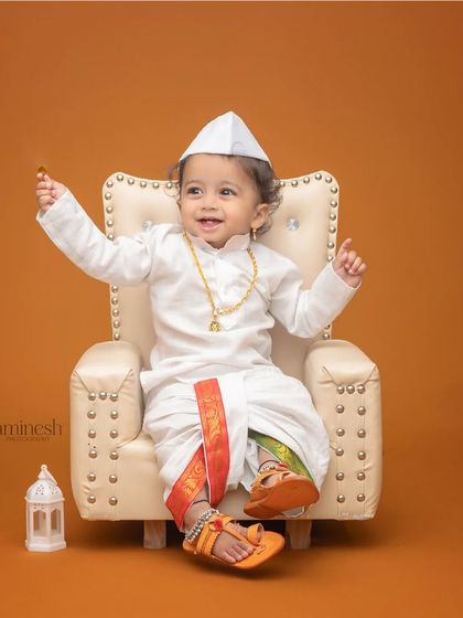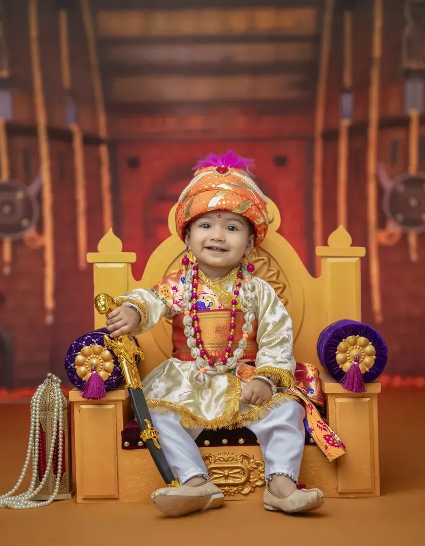 Celebrate the legacy of Chhatrapati Shivaji Maharaj with my Bal Shivba photoshoot. I provide a majestic setting with a royal throne, fort-like backdrop, and authentic-looking costumes and accessories. This is a powerful way to introduce your child to our proud Maratha history.