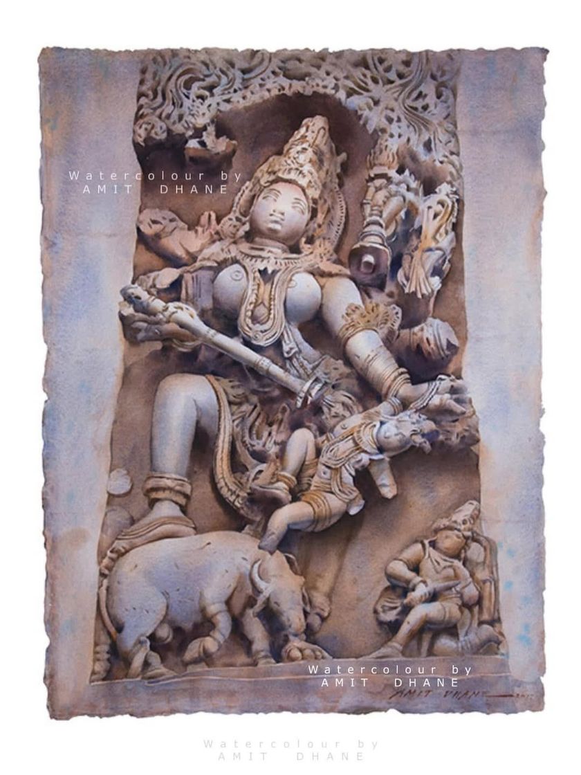 This is my unique series where I use watercolour on paper to create the illusion of ancient stone sculptures. Inspired by my visits to historical sites like Ellora and Hampi, I try to capture the texture, depth, and timeless energy of these carvings. This collection features deities, historical figures, and scenes from our cultural heritage.