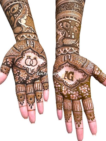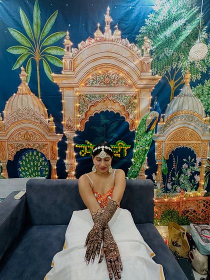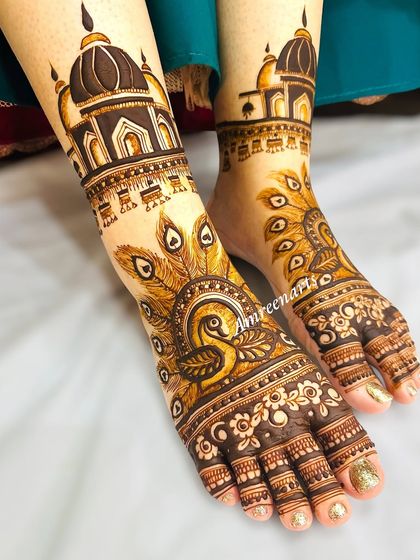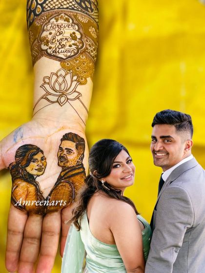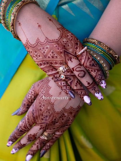 I create custom bridal mehndi with portraits, personal details, and full hand-foot coverage using my own natural henna, and I travel for weddings.