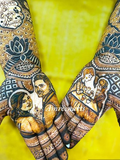 I create custom bridal mehndi with portraits, personal details, and full hand-foot coverage using my own natural henna, and I travel for weddings.