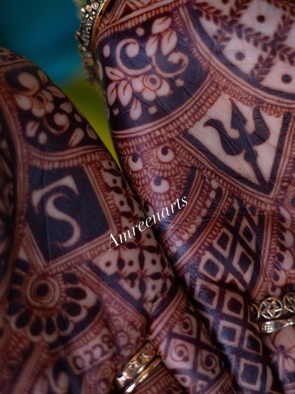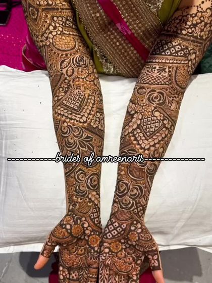 My full bridal hand designs extend from the fingertips to past the elbows, featuring a rich tapestry of patterns. I combine classic motifs like paisleys and florals with modern geometric shapes to create a dense, luxurious, and unforgettable look.