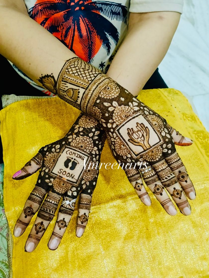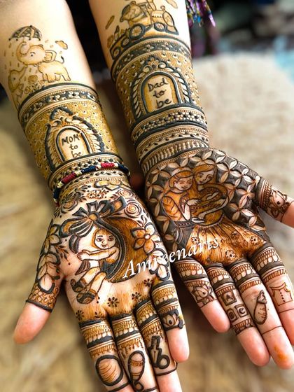 Celebrate the beautiful journey to motherhood with special baby shower mehandi. I love creating adorable and meaningful designs featuring "mom-to-be" and "dad-to-be" motifs, baby feet, or even portraits of the expecting parents.