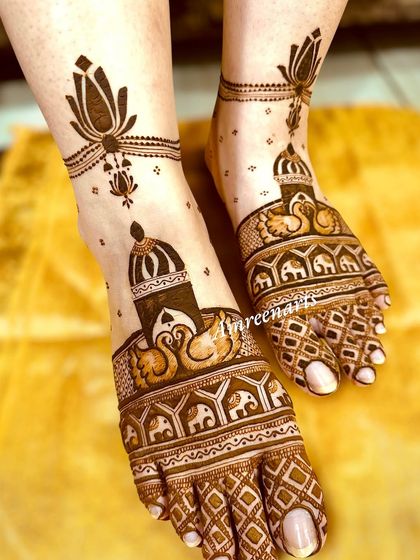 I create intricate traditional mehndi designs featuring cultural motifs like peacocks, paisley patterns, and architectural elements. My designs combine geometric shapes with floral patterns, emphasizing symmetry and detailed coverage.