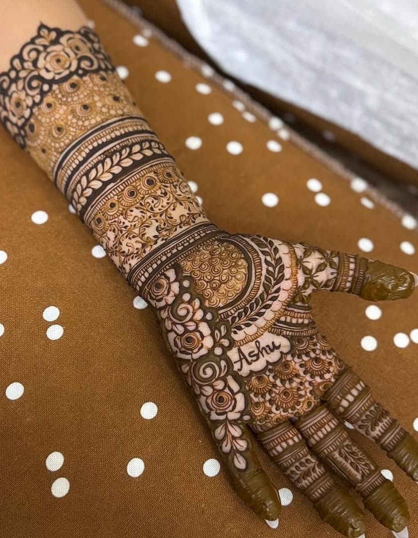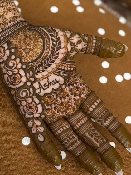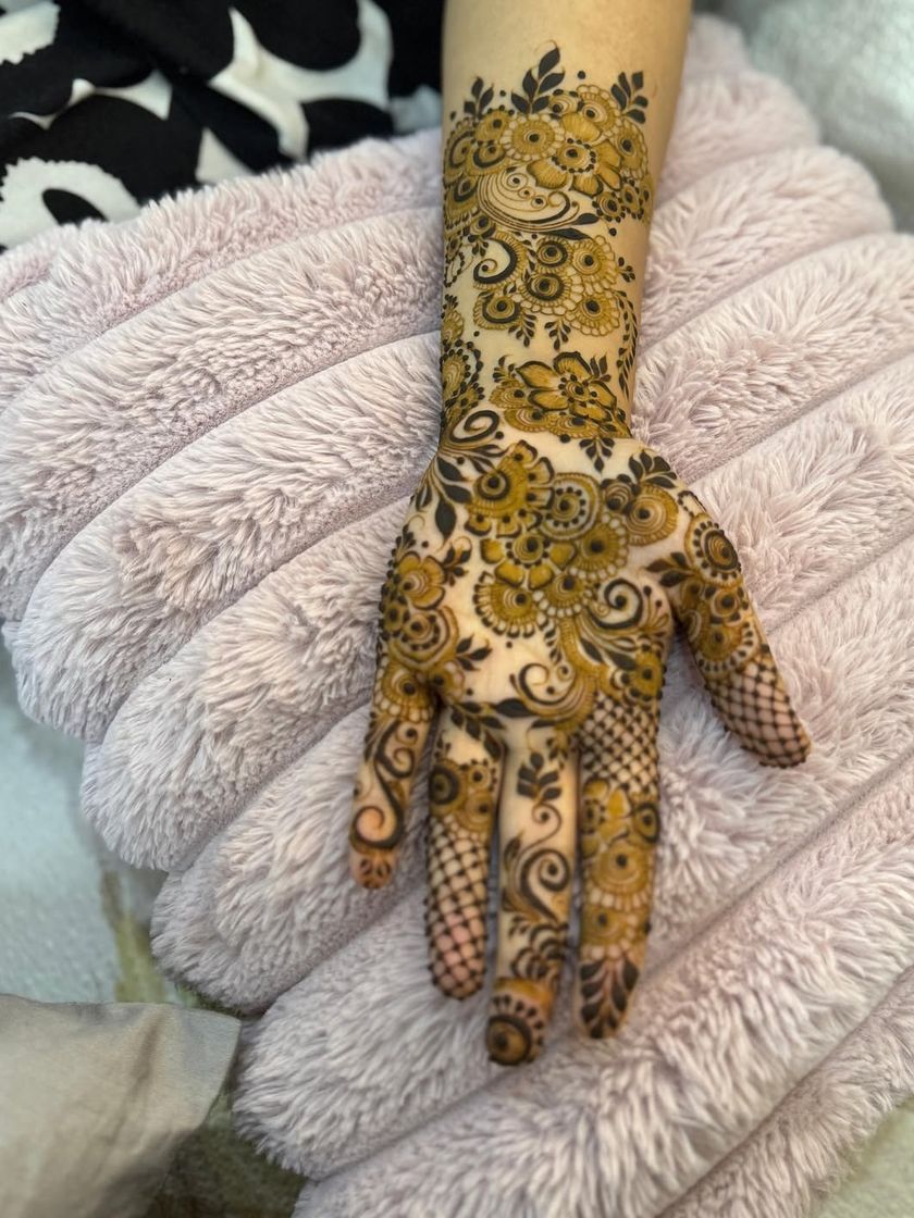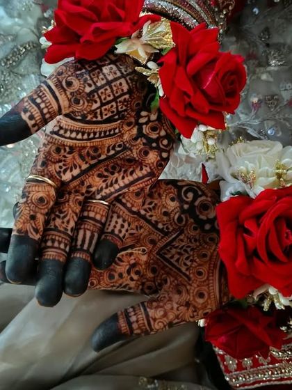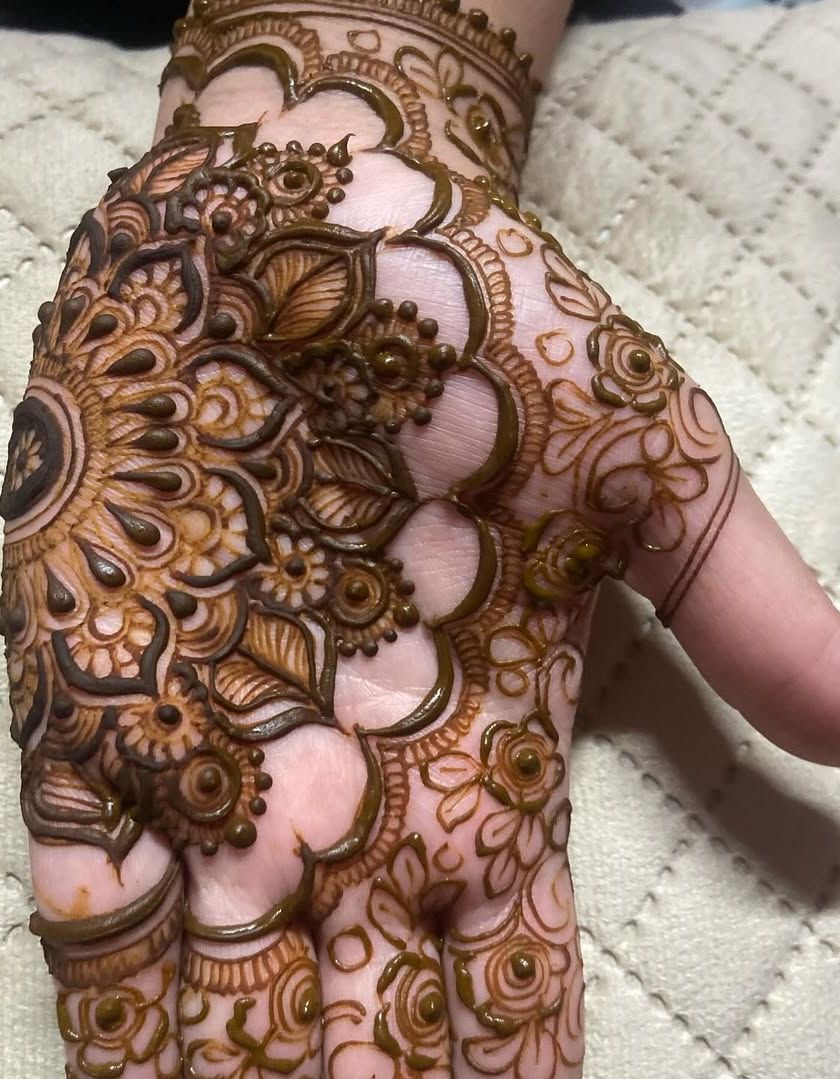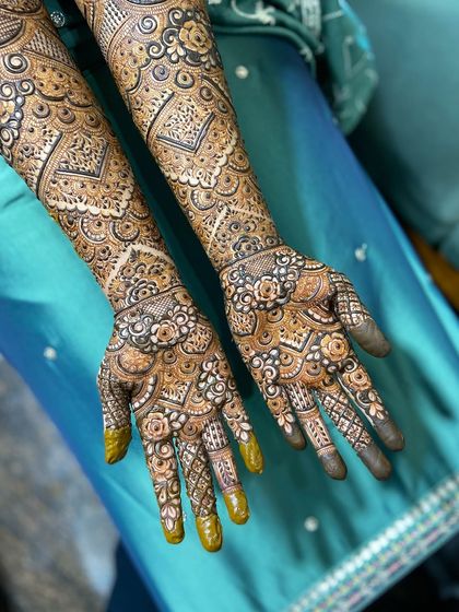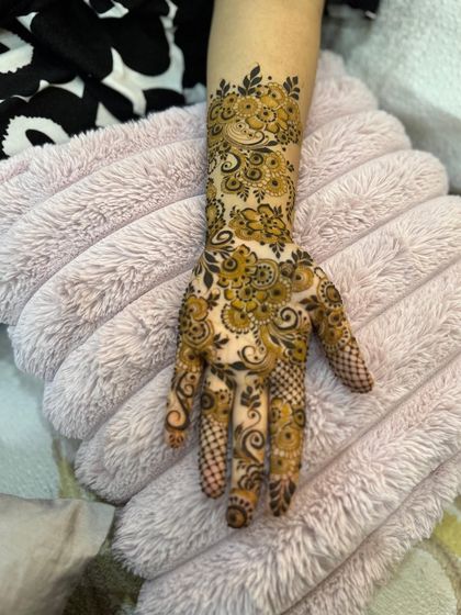 My specialty is creating dense, intricate henna designs that cover the full hand and arm. These are perfect for brides and for engagements, featuring a mix of traditional Indian patterns like paisleys and mandalas with modern elements for a rich, detailed look.