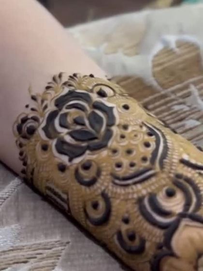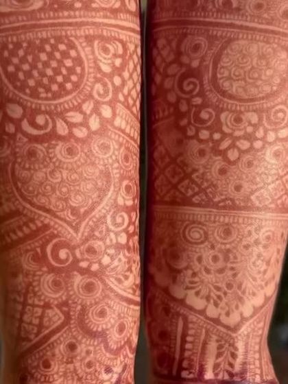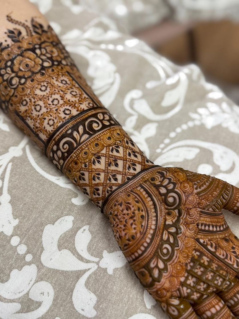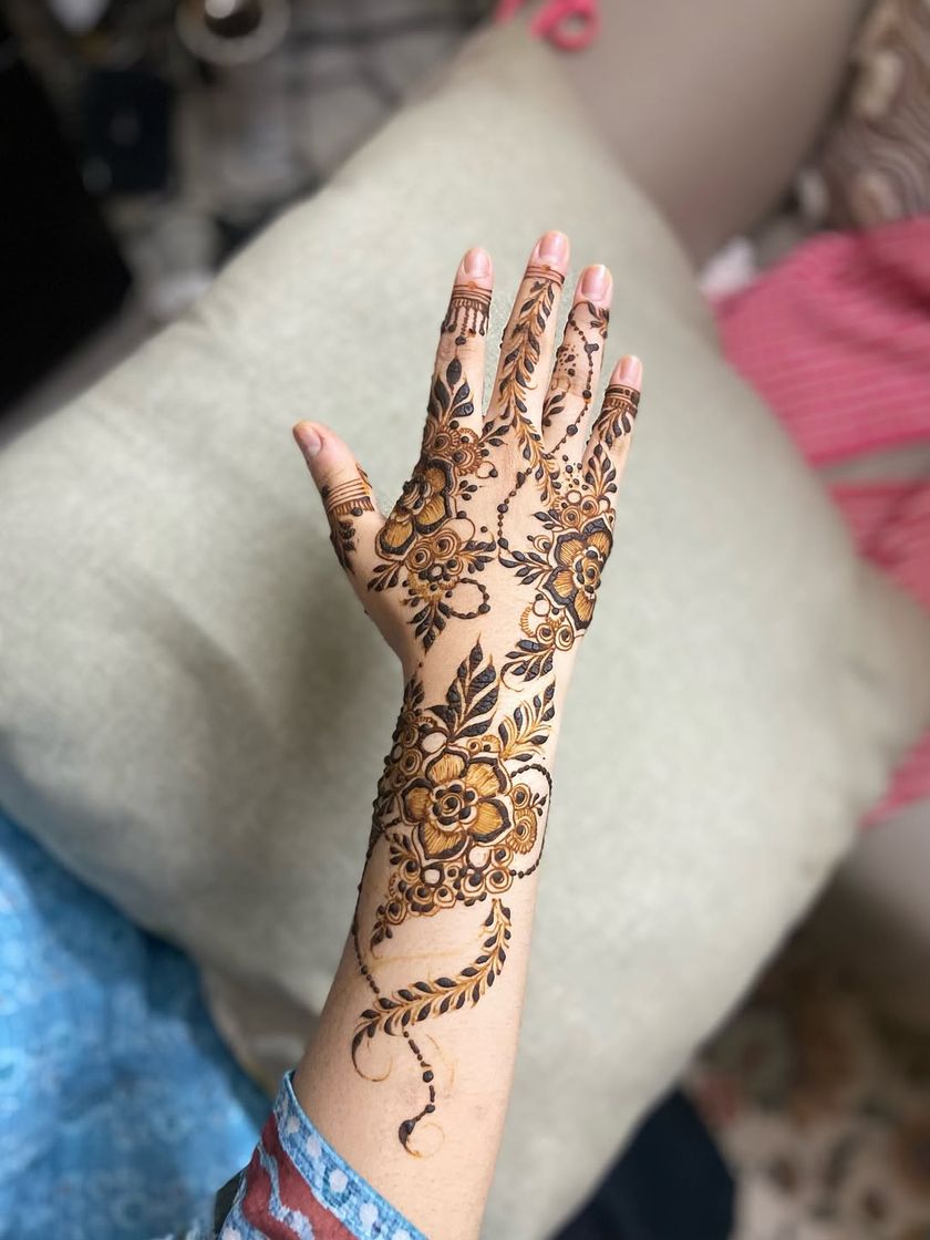 For a statement look, I create dense and detailed henna designs that cover the full hand and extend up the arm. These patterns are perfect for sangeets, festivals, or any occasion where you want your mehendi to be the centerpiece, featuring traditional Indian motifs like paisleys, checks, and florals.