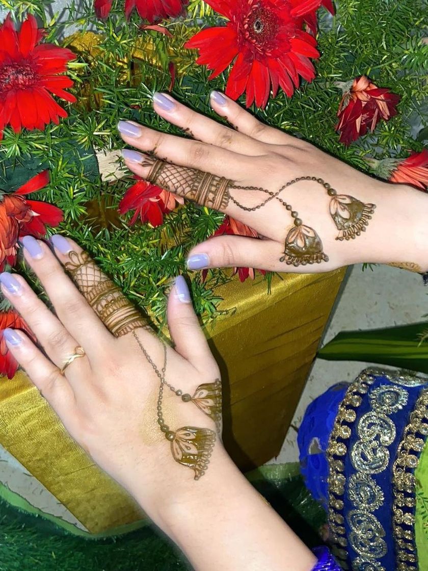 For those who prefer a subtle touch of tradition, I offer modern and minimalist designs. These include simple floral vines, elegant finger details, or unique motifs like henna jewellery, perfect for a chic and contemporary look.