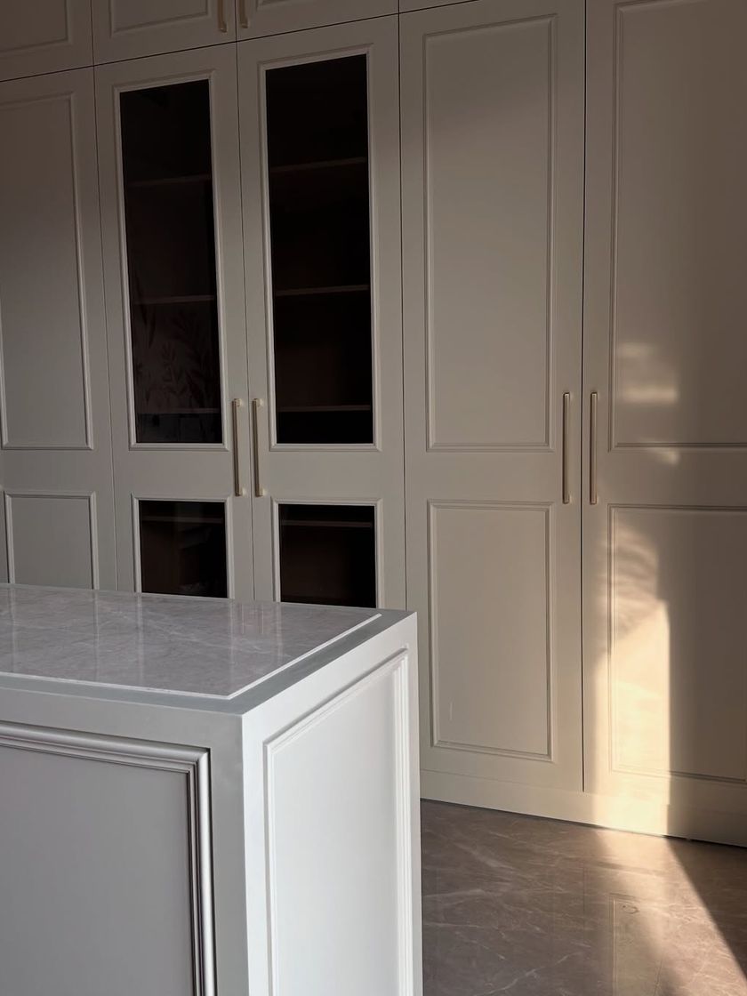 We specialize in creating bespoke walk-in closets and wardrobes that are both beautiful and highly functional. From spacious dressing rooms with central islands to cleverly integrated storage, we design solutions using materials like glass, metal, and premium laminates.