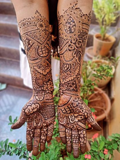 - I go all out for brides - from fingertips to elbows, and feet too, with dense, intricate bridal henna designs. You want classic Indian motifs, floral patterns, or something offbeat like mandalas? Bola na, sab ho jayega (Told you, everything's possible).