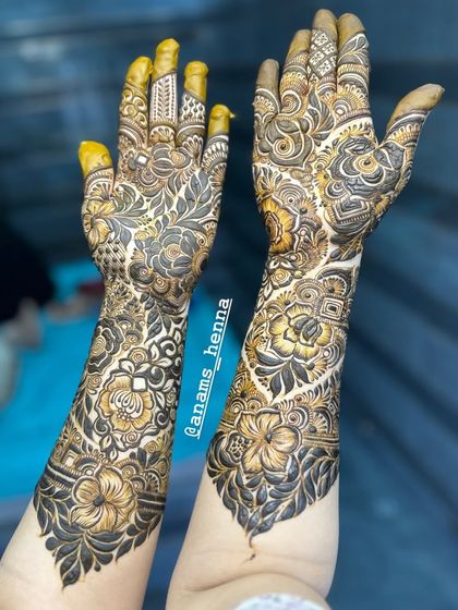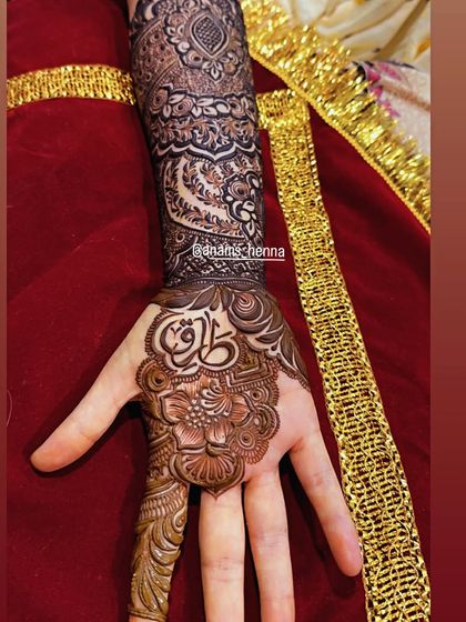 - Bridal mehndi is my jam. I do full coverage - from fingertips to elbows, and feet too. Each design is loaded with detail and your story, whether it’s hidden initials or names in calligraphy.