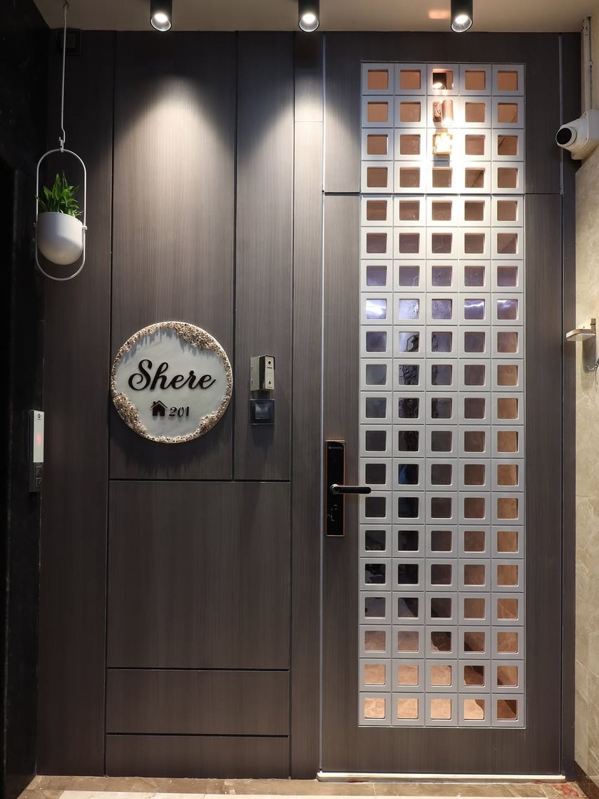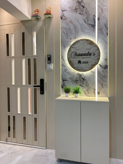 The entrance sets the first impression of a home. I design custom safety doors and foyer areas that are secure, stylish, and welcoming, often incorporating elements like backlit nameplates, integrated shoe storage, and unique jali work.