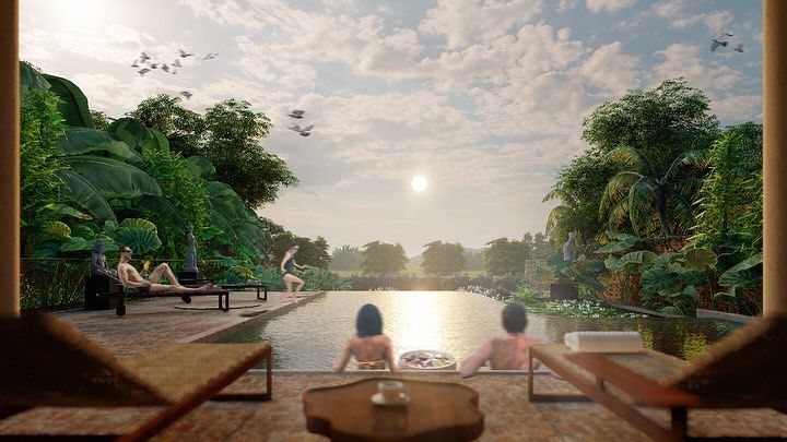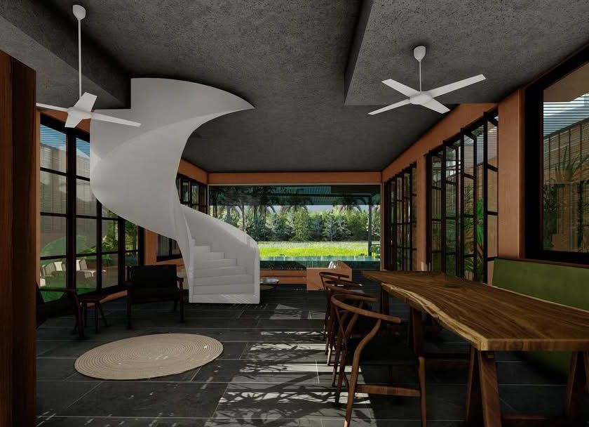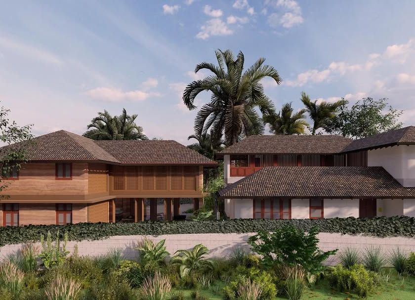 This is a preview of our five-bedroom luxury villa in Calangute, currently under construction. Designed as a spacious family home, it features two large common areas, a central swimming pool, and a terraced edible garden, all while preserving the stunning, undisturbed views of the adjacent paddy fields.