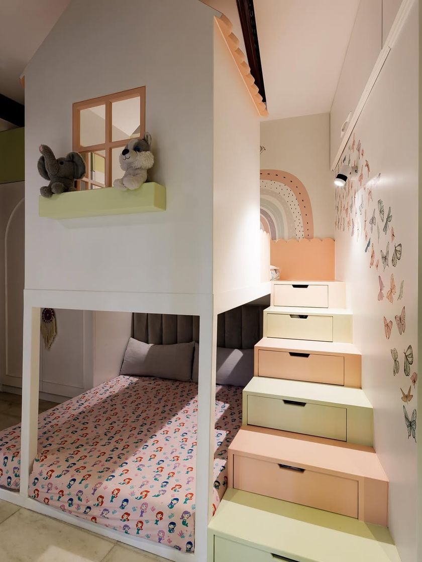 I love creating rooms that spark imagination and grow with your child. These designs focus on multi-functional furniture like house-shaped bunk beds with built-in storage, reading nooks, and even fun elements like slides and climbing walls to encourage active play.
