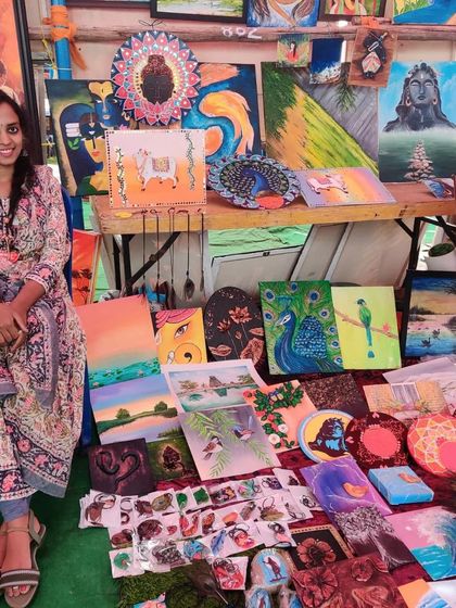 Vanakkam! I’m Anesha. My hands are always busy—sometimes with Lippan and kolam, sometimes with resin or Pichwai. If I’m not painting, you’ll find me on a saalai payanam (road trip) with my family, soaking up colours at a market or just chilling with birds—pakshigalondige naanu. Bangalore’s art buzz keeps me going. My art? It’s a piece of my travels, my stories, my heart.