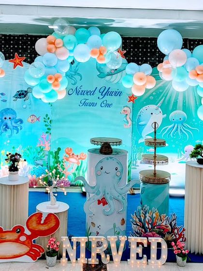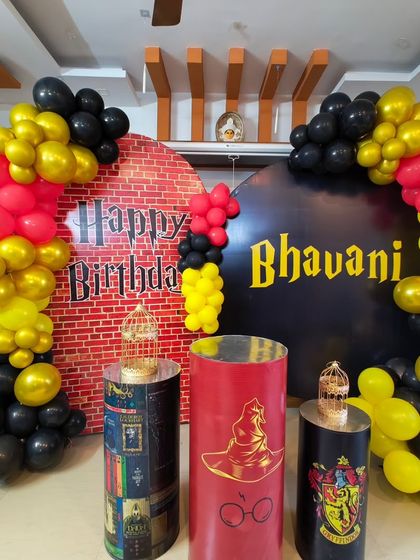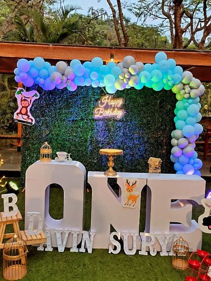 - Full-blown stage setups for bigger venues - big backdrops, balloon garlands, character cutouts, the works.
