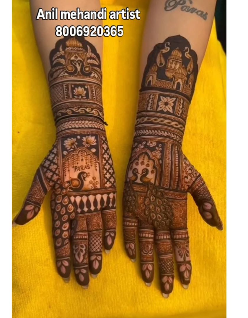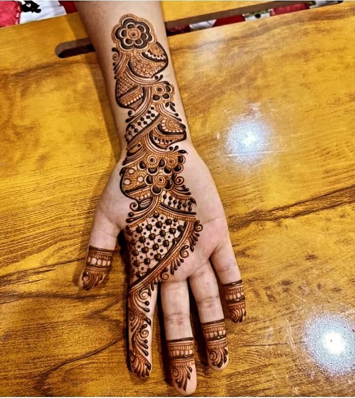 For those who love classic, full-coverage mehandi, I offer a wide range of traditional designs. These patterns feature timeless motifs like peacocks, elephants, lotuses, and intricate geometric jaal work. I ensure every line is sharp and the final stain is deep and rich.