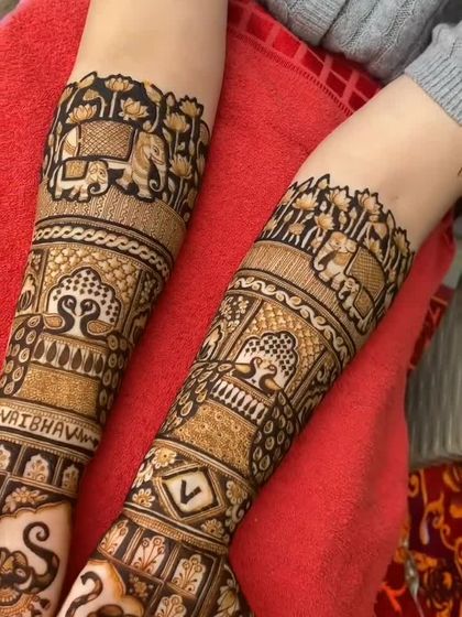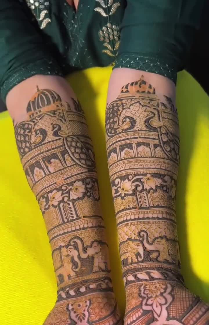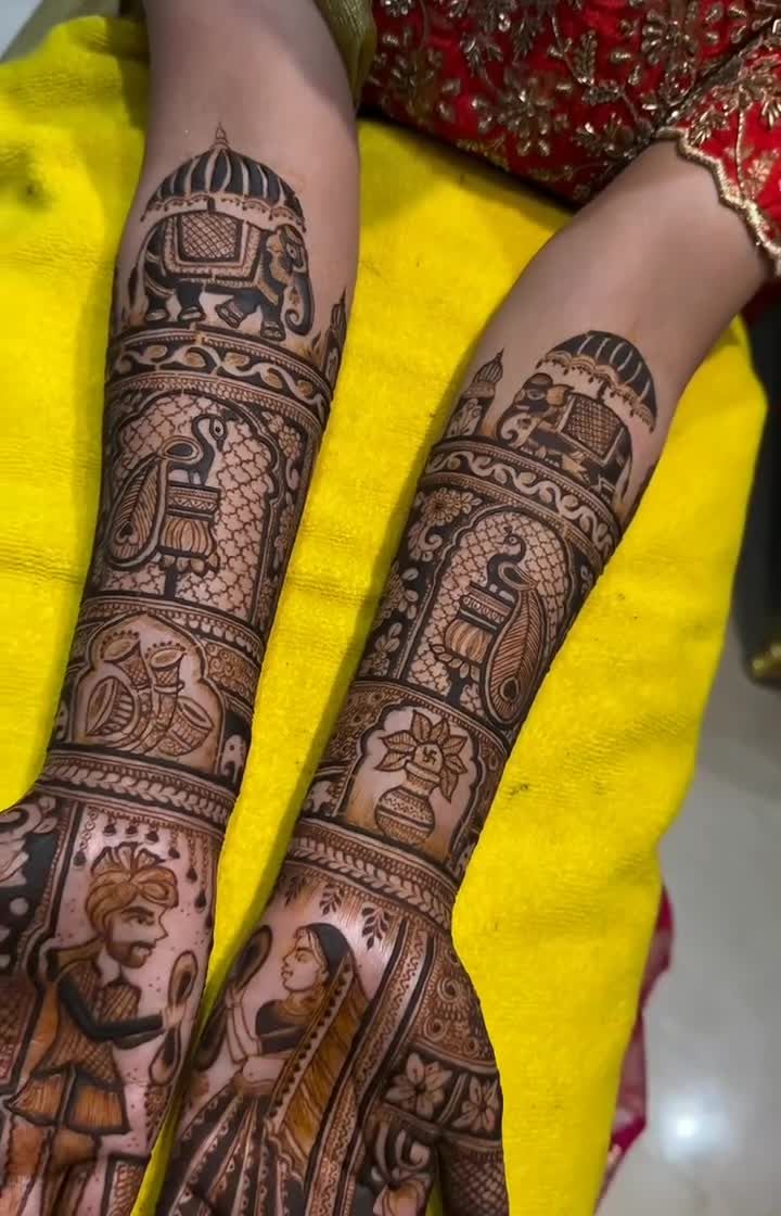 My specialty is the classic Rajasthani style, known for its fine lines and traditional motifs. I love creating designs filled with peacocks, elephants, paisleys, and palace architecture to give you a timeless and royal bridal look.