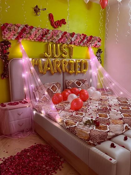 - Romantic bridal room setup with rose petals, balloons, and fairy lights. Makes that first night special.