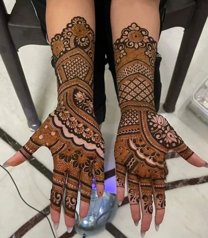 For a look that is both traditional and modern, I design mehndi with clean lines and intricate patterns. This includes beautiful domes, arches, and detailed jaal (net) work for a sophisticated finish.