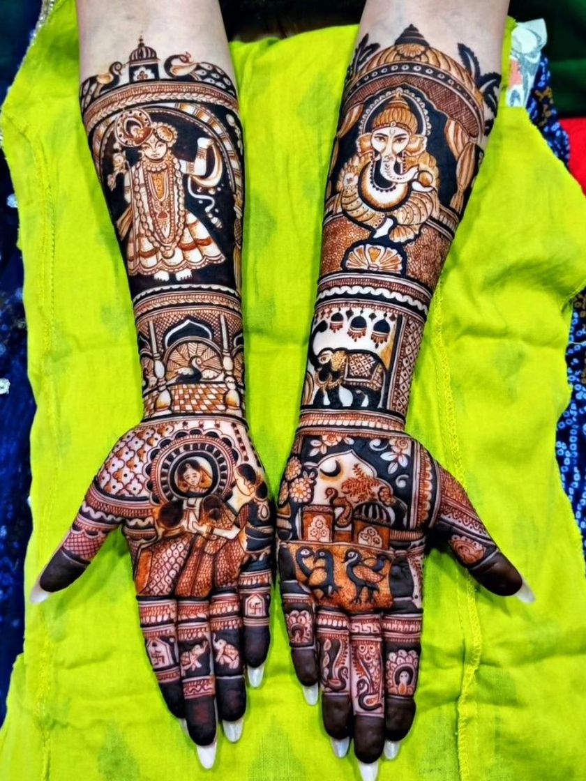 I love telling a story through mehendi. I can create detailed portraits of couples, figures like a bride on a swing, or deities like Ganesha and Radha-Krishna to make your henna truly unique.