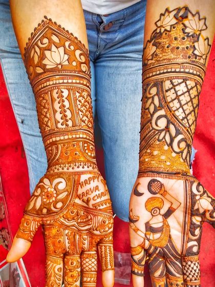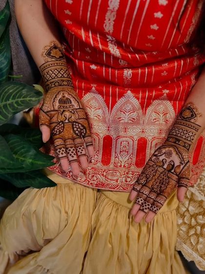 This is my specialty. I create dense, detailed Rajasthani and traditional mehendi designs that cover the hands and arms, perfect for a bride's big day. Each design is packed with classic motifs and fine linework for a stunning result.