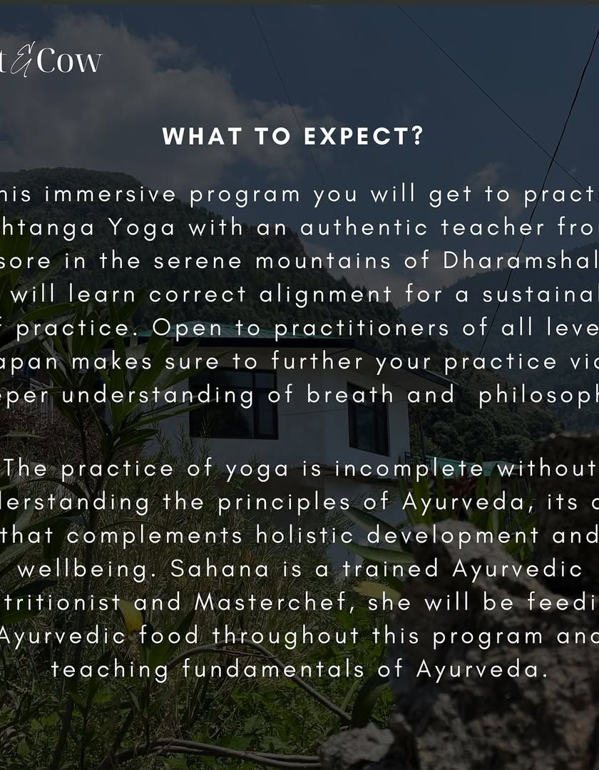 These are intimate getaways designed to nourish you completely. I curate these retreats in serene locations like the mountains of Dharamshala, combining deep yoga practice with other disciplines like Ayurveda. They are open to all levels and focus on providing a space for you to deepen your practice and understanding of holistic living.