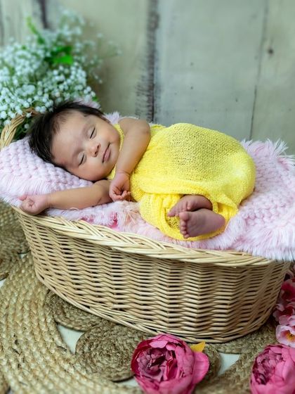 We specialize in creating intimate and tender portraits of newborns in cozy settings. Our sessions feature soft, knitted outfits and natural elements like flowers and woven baskets to enhance the ambiance.