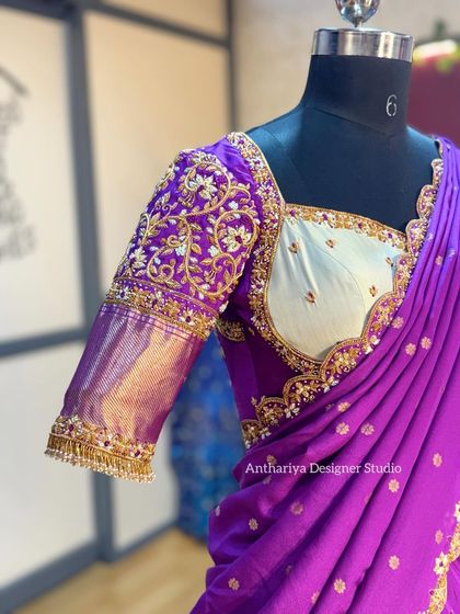 - Work: Detailed Maggam or Aari work on the blouse neckline and sleeves (scaled-down bridal quality).