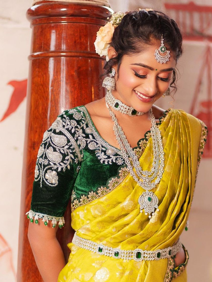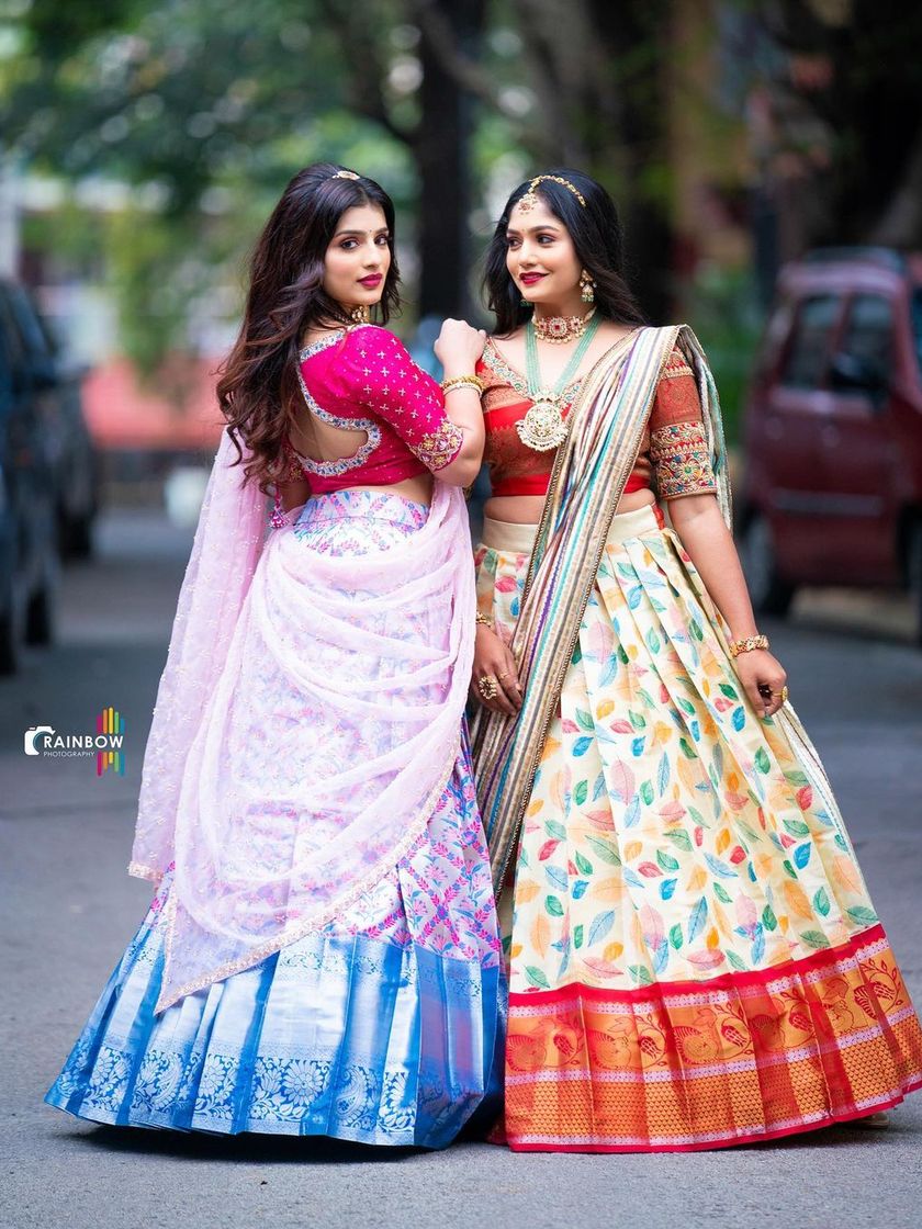 My core collection features a wide variety of Langa Voni, also known as half sarees, a staple for South Indian traditional events. You can find everything from classic Kanchipuram silks for religious ceremonies to modern interpretations for parties, all available for rent in Bangalore.
