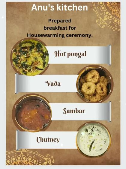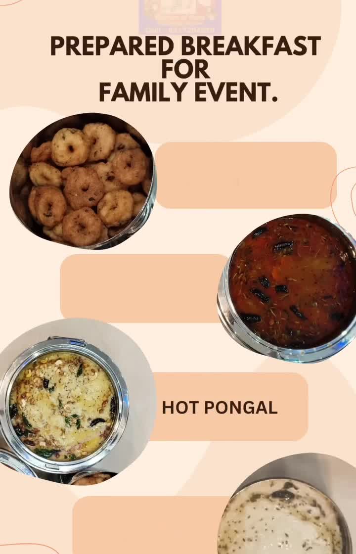 Start your morning events, be it a housewarming, a small pooja, or a corporate meeting, with a delicious and wholesome breakfast. I offer traditional South Indian tiffin items like hot Pongal, crispy Vadas, and savory Kara Bath, all served with fresh Sambar and Chutney.