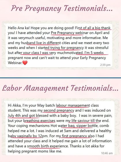 Pregnancy & Birth Classes (Tamil/English) - I run online/offline classes for pre-pregnancy, early pregnancy, labor, and breastfeeding, including Tamil prenatal classes.
