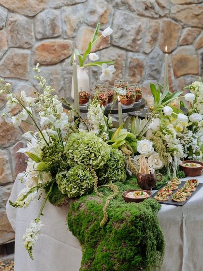 - The Earth Table: Styling includes moss runners, luxury flowers like Hydrangeas and Tulips, and taper candles.