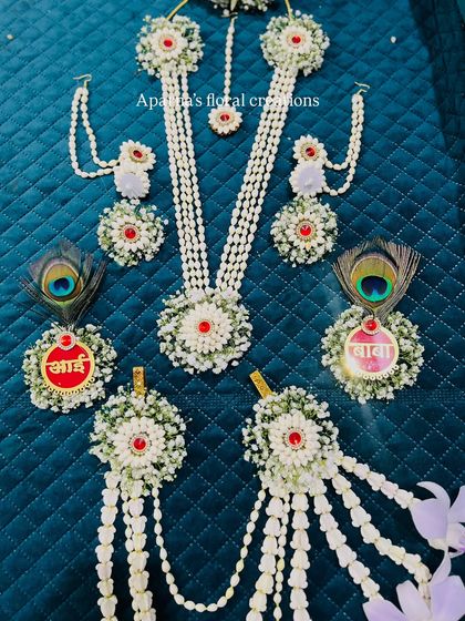 I focus a lot on traditional events. Dohale Jevan (baby showers) are my favourite - I make baby shower flower accessories for the mom-to-be, and even medallions with "आई" (Aai - Mother) and "बाबा" (Baba - Father). For Haldi, I bring out all the bright colours you expect from Haldi floral jewellery - yellows, pinks, and combos that pop. Weddings and Mehendi? I craft handmade flower necklaces, earrings, and even Kalire for brides. I also take orders for festivals, like Sankranti (Halwa jewellery for kids), and create customised deity garlands for Bappa (Lord Ganesha).