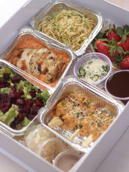 I've created the perfect meal kits and grazing boxes for a cozy and romantic night in. Choose from Italian or Asian cuisines for my 'Date Night for 2' boxes, or opt for my special Valentine's treats like chocolate-covered strawberries and bento cakes. Everything is effortless and delicious.
