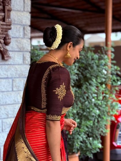 We handcraft exclusive bridal blouses, blending timeless tradition with luxury. Our designs feature intricate antique zardosi and temple jewelry motifs for a perfect and elegant bridal look.