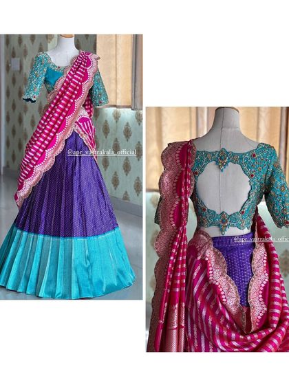 We make custom half-saree sets for weddings and festivals, using rich silks, brocades, and detailed handwork, and work with you to create the design you want.