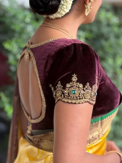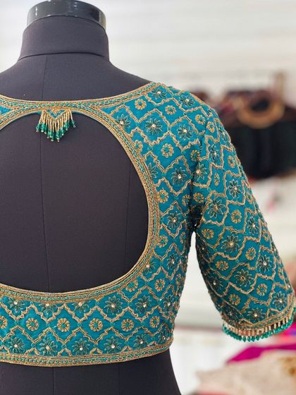 We make custom bridal and occasion blouses with hand-embroidered jewellery motifs, quality fabrics like velvet and silk, and options for heavy or light designs based on your preference.