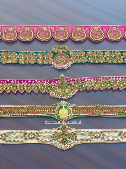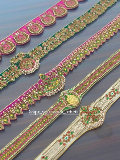 We create intricately embroidered waist belts designed to enhance both traditional and modern attire. Our belts feature detailed embroidery work and embellishments, including Kundan detailing and temple jewelry stones.