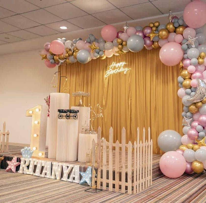 A child's first birthday is a huge milestone, and we love making it special. We design everything from the main backdrop to small details, creating setups like pastel wonderlands or princess themes that are perfect for photos and memories.