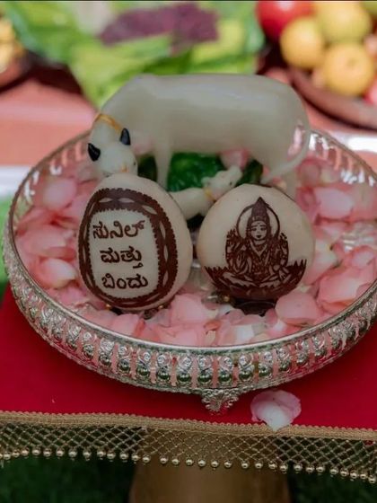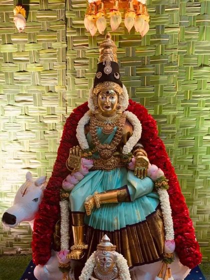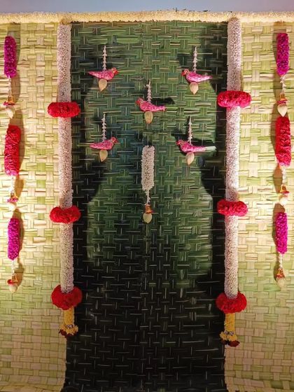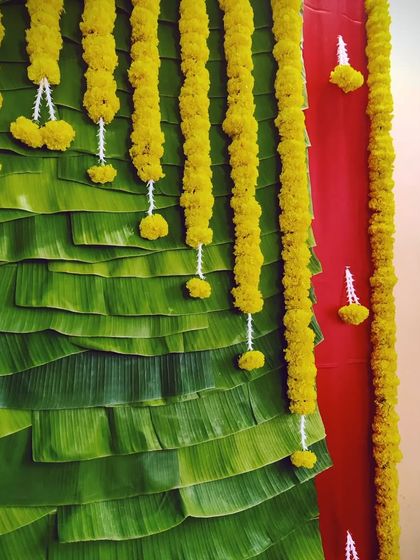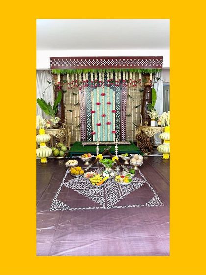 - For pooja and festival decor, we go all out. Our backdrops are done with banana leaves, coconut palm, marigold and rose garlands - sometimes even lotus buds. We use traditional props like brass kalash, ornate chairs, and floor rangoli. If you want, we also carve coconuts with names or deity images for an extra personal touch.
