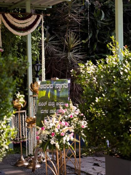 - For house warming (gruhapravesham), we put together warm, welcoming entrances with floral decor, brass lamps, and even custom signs (Kannada signs are popular with our clients). The whole house gets a festive glow-up - fairy lights outside, fresh garlands inside.