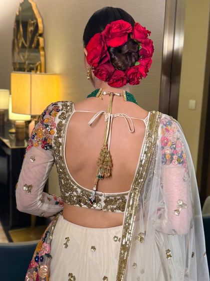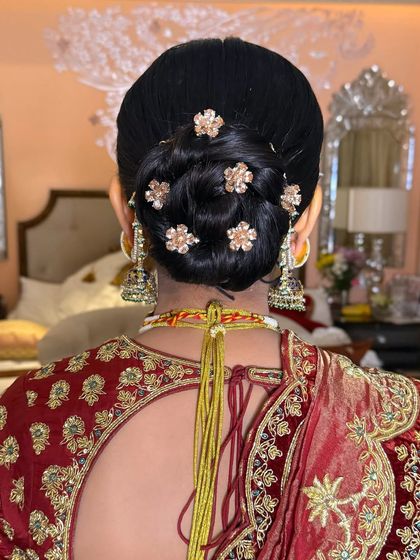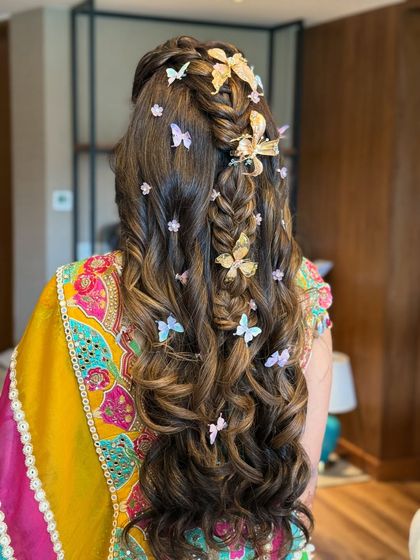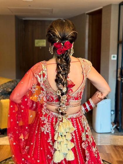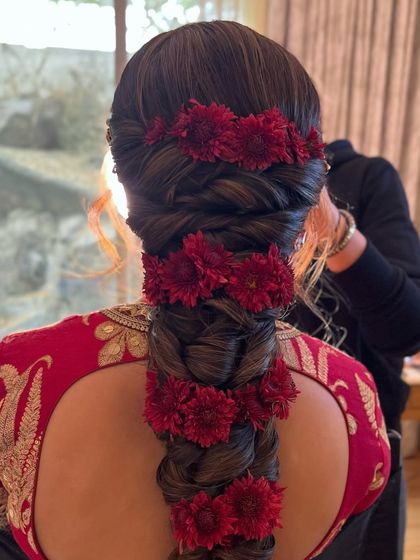 Bridal & Event Hairstyling - I do intricate floral updos, bubble ponytail hairstyle, glam waves for sangeet, and accessorised braid mehandi.