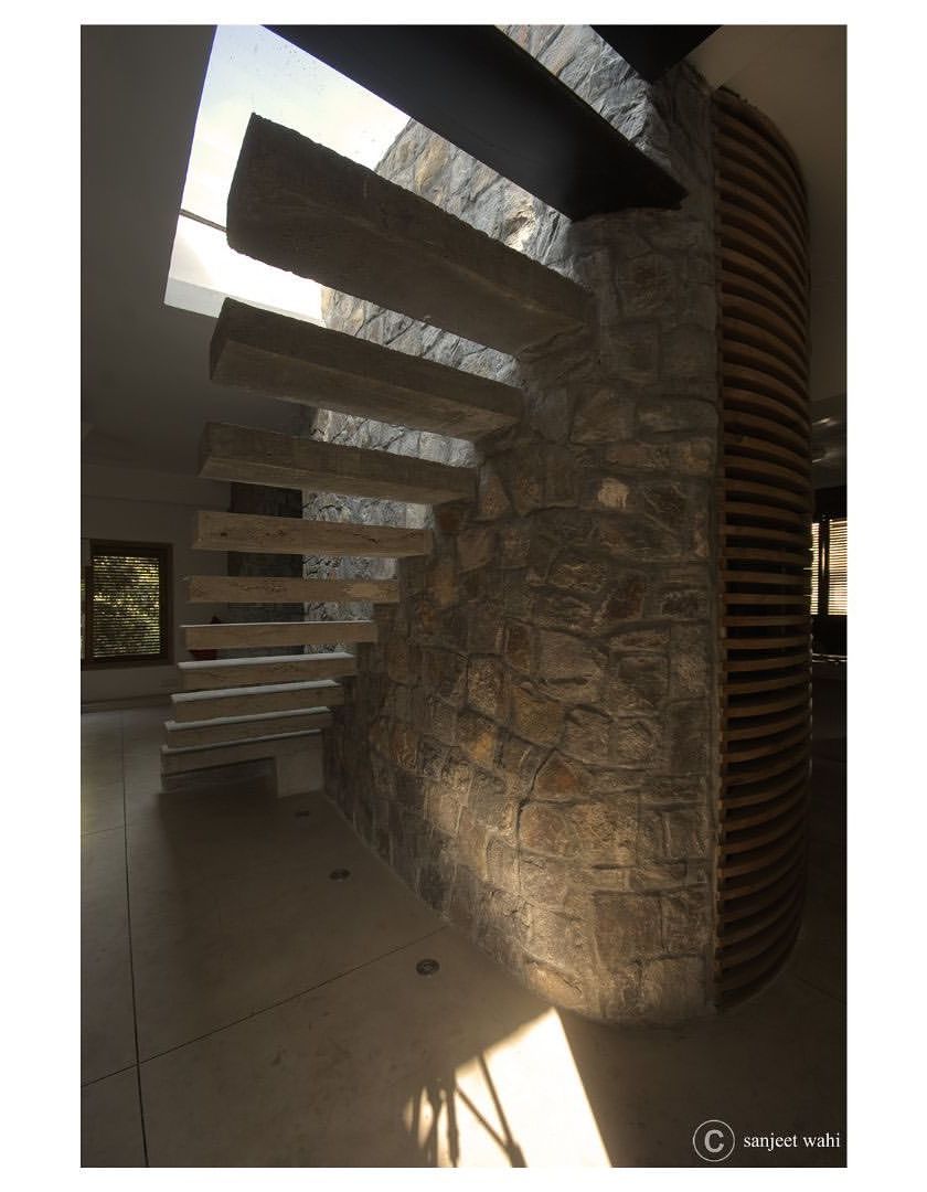 This apartment renovation in Noida was designed as a modern organic dwelling with an ethno-modern aesthetic. The core element is a curved wall of stone and brick that deforms to create seating and surfaces, showcasing how structural elements can become integrated, functional art.