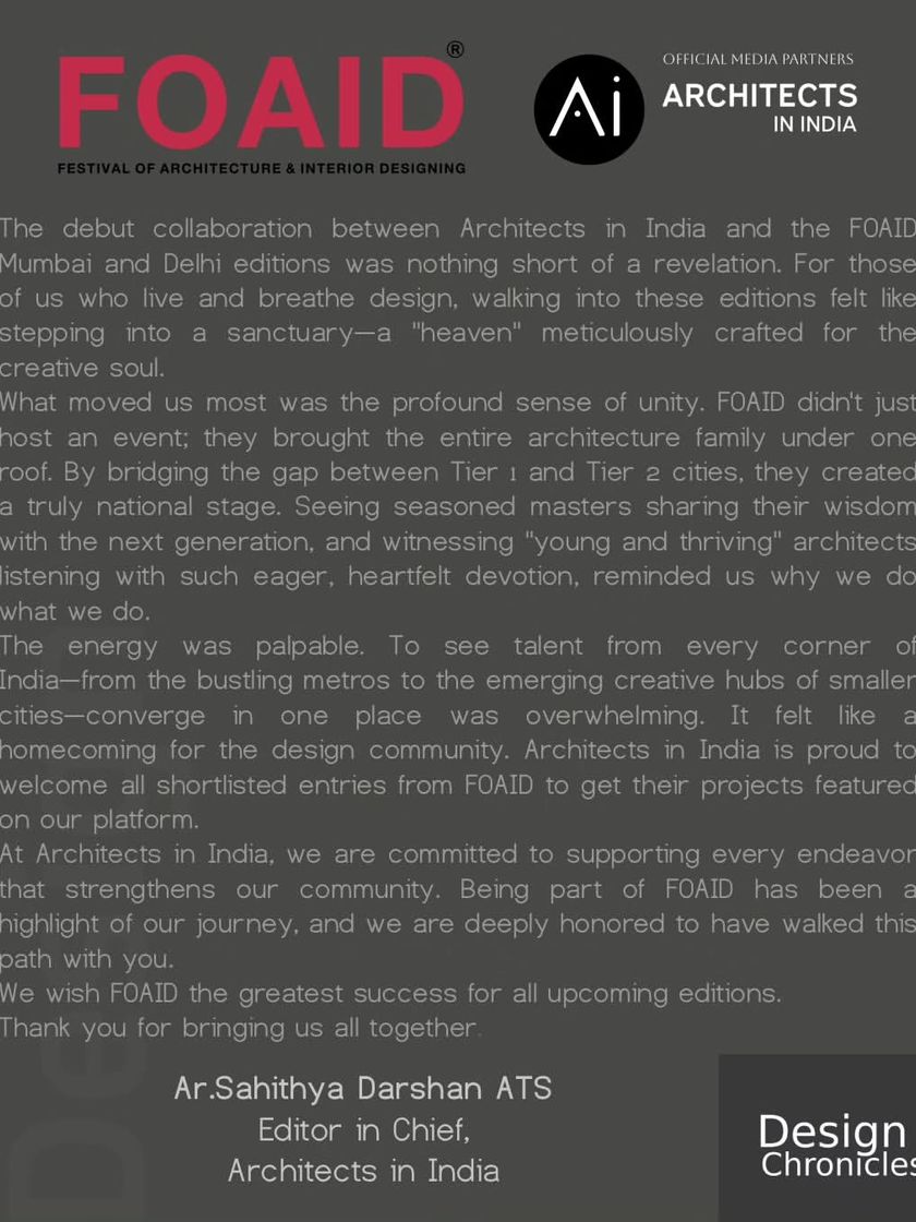 We are committed to amplifying Indian design on the world stage. As official media partners for prestigious events like the World Architecture Festival (WAF) and FOAID, we bring you exclusive coverage, from compelling presentations to celebrating the winners. This section is a testament to the incredible talent within our community and their well-deserved global recognition.