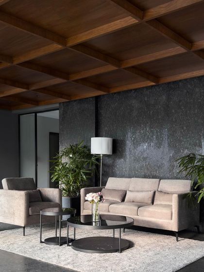 - Ceiling Works: Custom wooden coffered ceilings or linear rafters with recessed lighting.