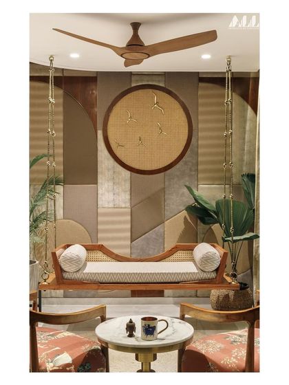 - Living rooms with wooden jhulas (swings), marble accents, and TV units that pop