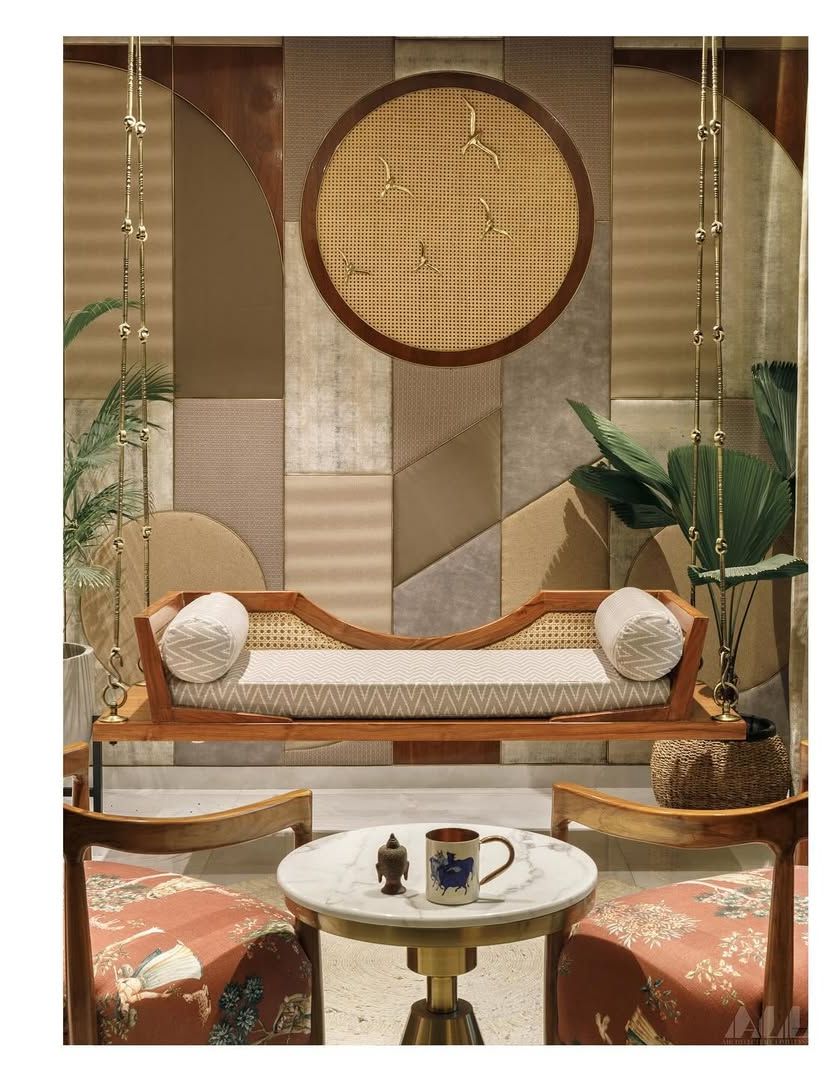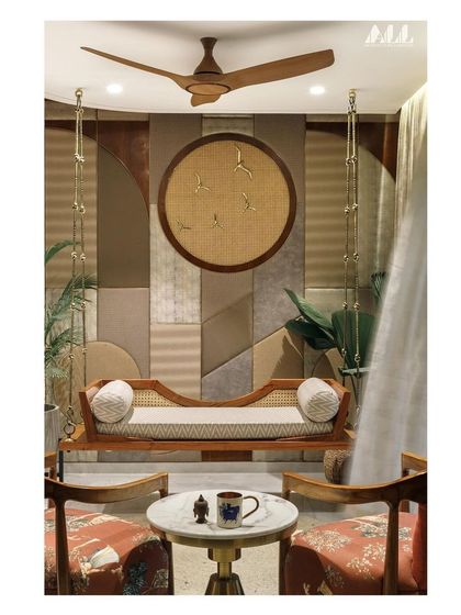 Our living rooms are designed as the heart of the home, blending modern aesthetics with traditional Indian elements. We create showstopper spaces featuring custom furniture like wooden jhulas, elegant marble backdrops for TV units, and carefully selected textures that feel both luxurious and personal.