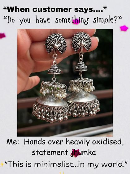 Honestly, jhumkas are my thing. From classic domes to quirky peacock and tabiz (amulet) shapes, I’m always experimenting. I add beads, shells, pearls, mirrors - whatever feels fun. You’ll find both feather-light pairs and big, bold ones for parties.