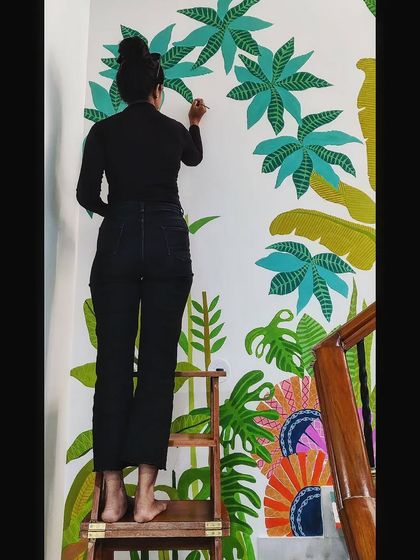 - Lush tropical mural vibes with big leaves and bold colours (my personal favourite, yaar)