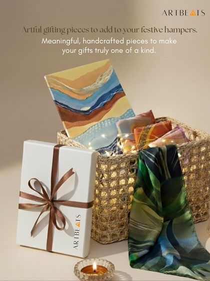 I create original art-based corporate gifts like scarves, pocket squares, and decor in small batches, using sustainable materials and custom themes, so your bulk gifting is personal and not generic.