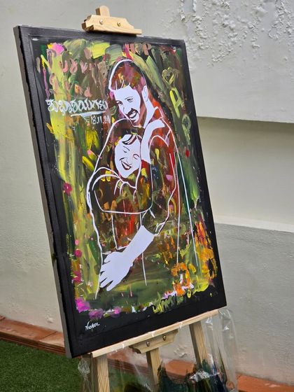I paint your event live on canvas in my Magicart style, so you get a unique artwork made during your celebration, not just a photo.